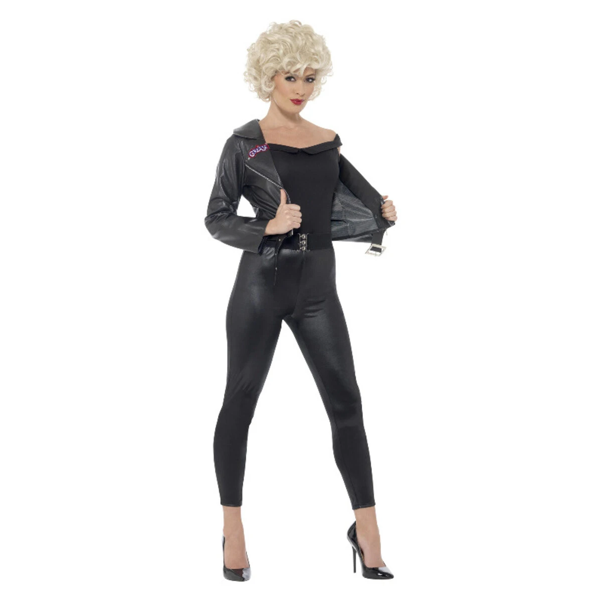 Het Grease Kostuum Sandy bestaat uit de volgende elementen: jasje, shirt, leggings en riem.