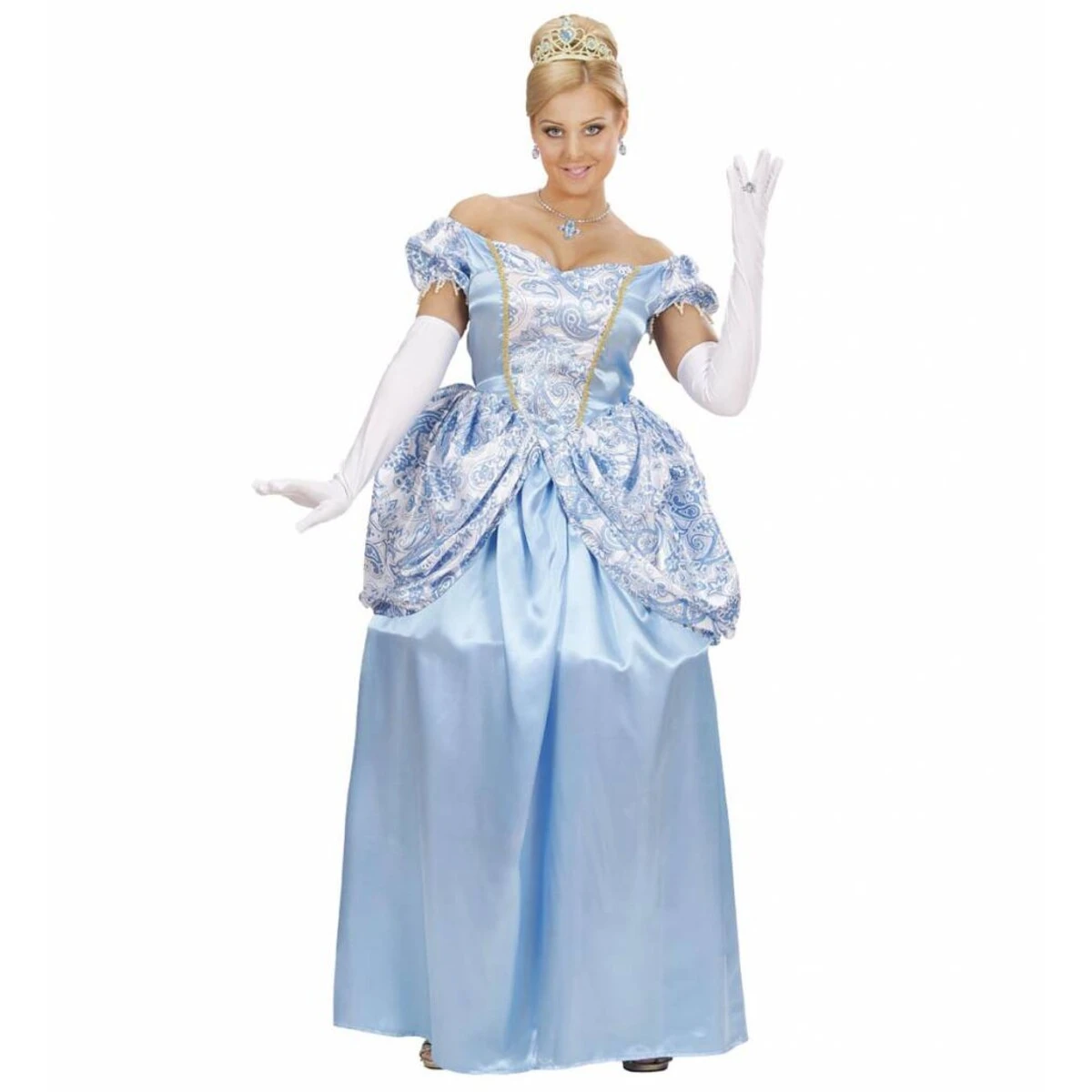 Blauwe prinses wordt geleverd met de volgende artikelen: jurk met draadhoepel, handschoenen, tiara