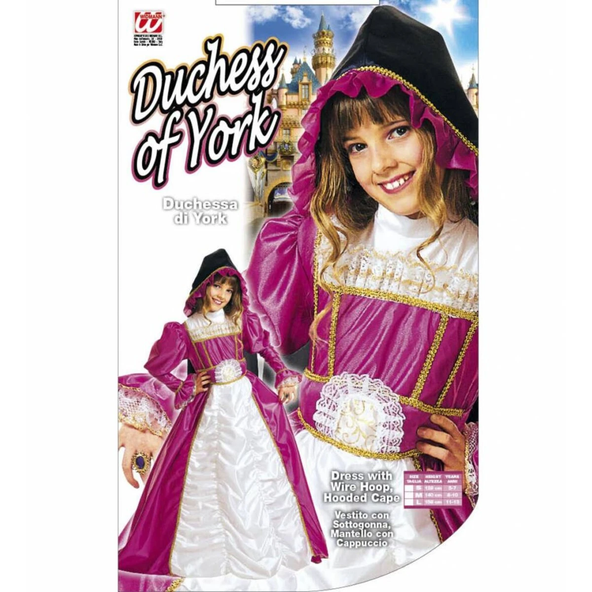 De Hertogin Van York bestaat uit de volgende elementen: jurk met draadhoepel, cape met kap