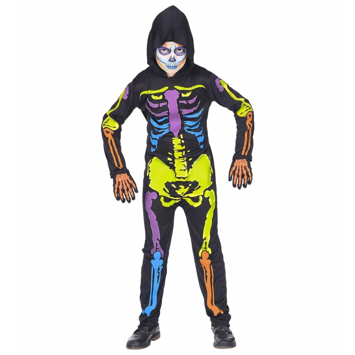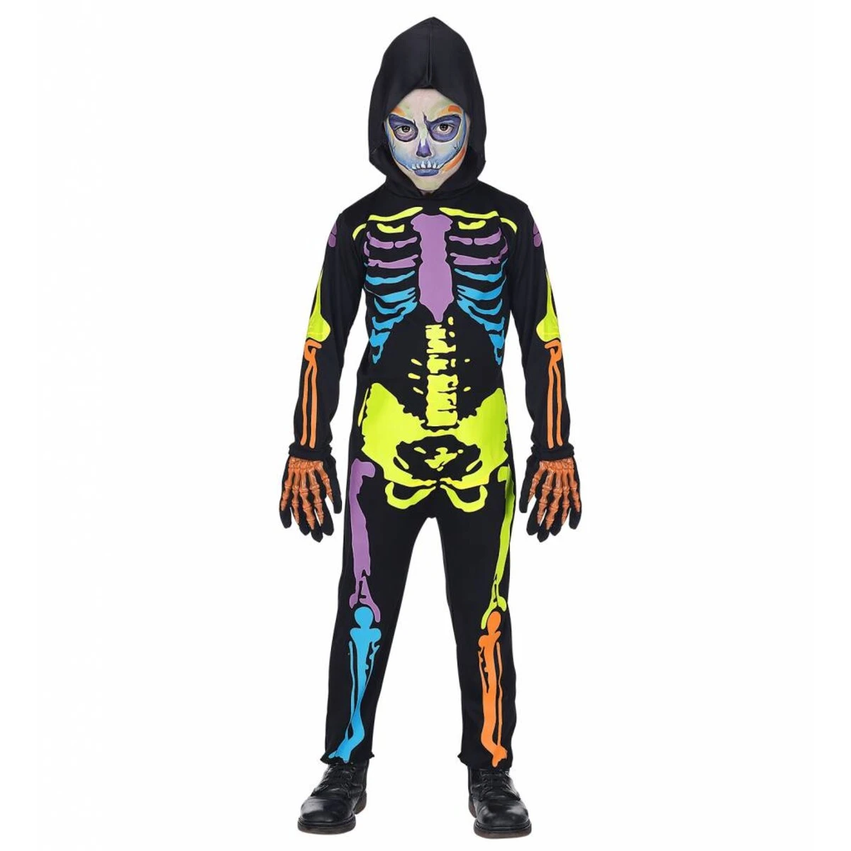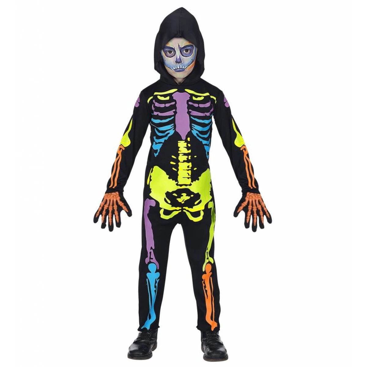 Het Kleurrijk Skelet bestaat uit de volgende elementen: overall met kap. Dit product valt onder de categorie: Halloween Kostuums.