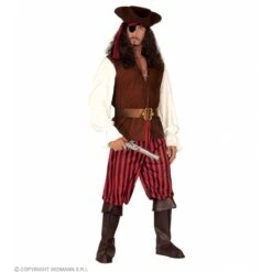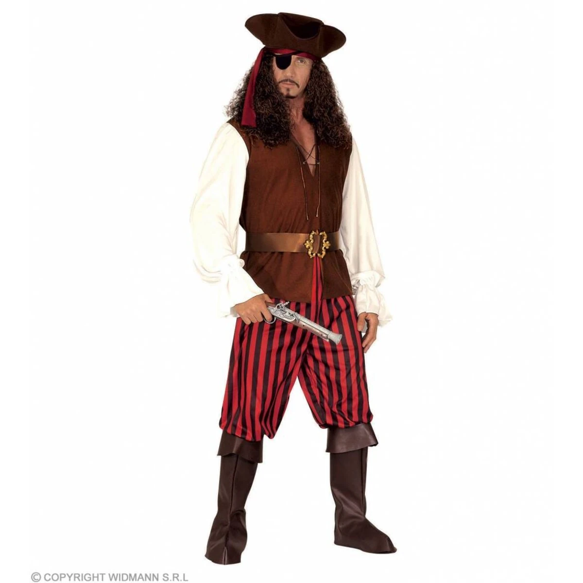 Het Kostuum Piratenman bestaat uit de volgende elementen: shirt met vest, broek, riem, laars hoezen, hoofdband, muts, ooglap. Dit product valt onder de categorie Piraten Kleding.