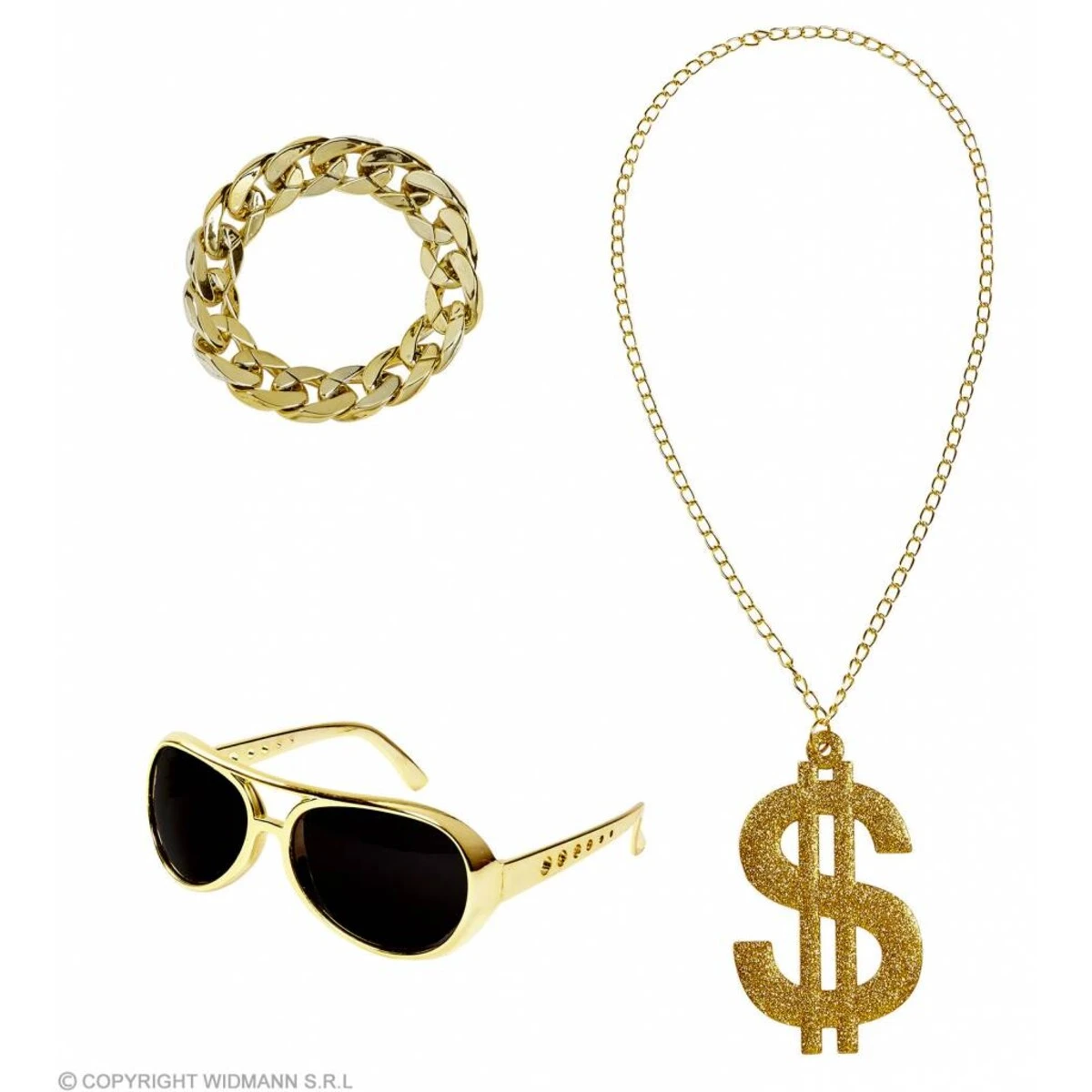De Rapper Setbestaat uit de volgende elementen: zonnebril, dollar ketting, armband. Dit product valt onder de categorie Sieraden