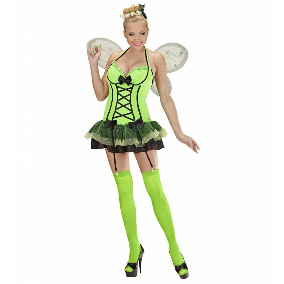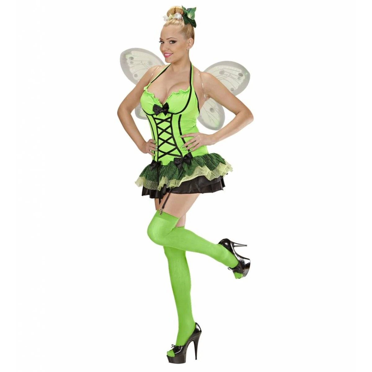 Vlinder groen wordt geleverd met de volgende artikelen: jurk met bandjes, vleugels, bloem & boog haarkam