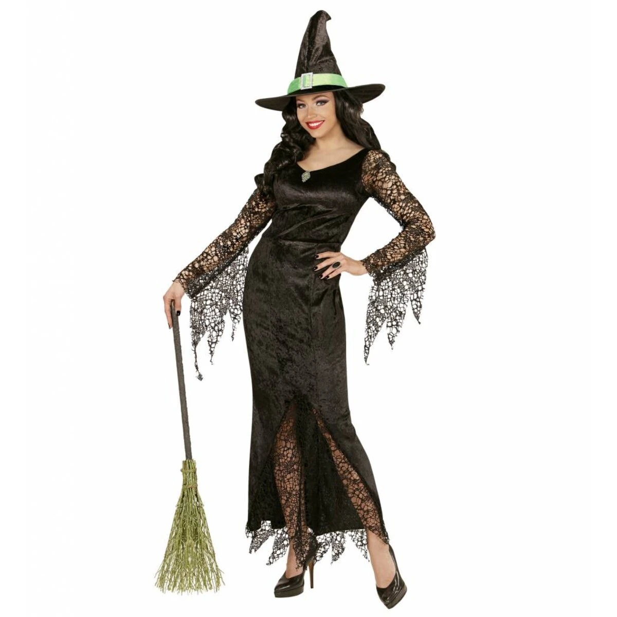 Dit mooie zwarte heksen kostuum is bij de mouwen en benen afgewerkt met slierten die doen denken aan spinnenwebben. Dit is een mooie outfit voor een Halloween feestje of voor carnaval.